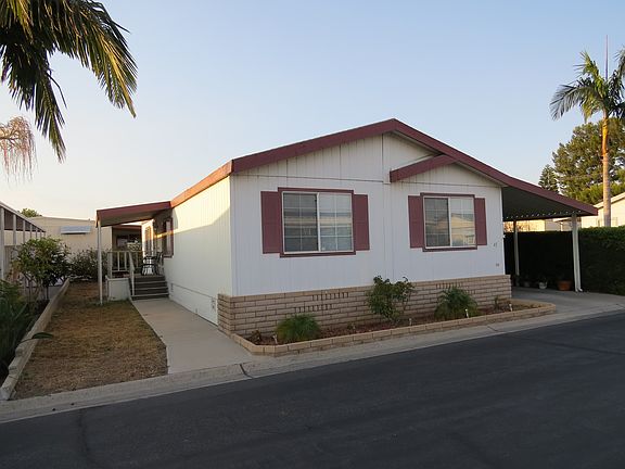 Beautiful 3 bedroom / 2 bathroom manufactured home in the sought-after Carriage Estates of Orange. Home has a nice open floor plan and 1,248 sq. ft. of living space. Kitchen is bright, well-kept, and has a large pantry for extra storage. Living area, dining area, and all bedrooms are carpeted. Linoleum floors in kitchen and restrooms. All bedrooms are very ample and have a neutral color scheme. Master bedroom has a very spacious walk-in closet and built-in storage in the master bathroom. Additional features include: central A/C, porch, private garden in back of home, storage shed, laundry area, and much more. This family park offers various private amenities to it's residents such as a club house, pool, and spa. Home is also within the boundaries of the Orange Unified School District. Located by the 55, 57 and 22 freeways.