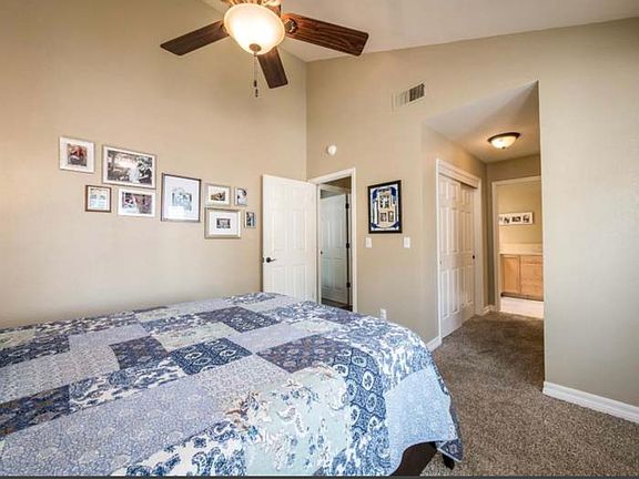 Private master with tall ceilings and large windows. Room can come furnished or unfurnished. Carpet bedroom with tiled bathroom. Two closets. Attached private bathroom with ample storage and counter space. Large, tiled, walk-in shower. Single story home. No pets. No smoking inside. Keep property clean. Lawn will be taken care of by owner. Parking on street. Rent and utilities due at 1st of the month. Limit guests.