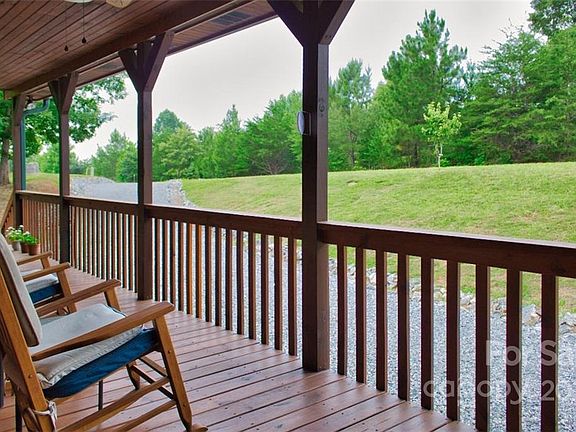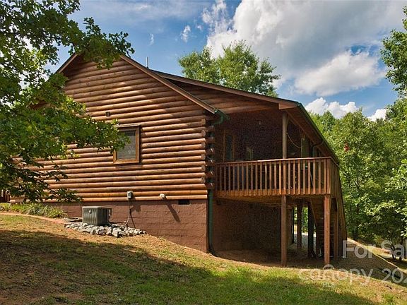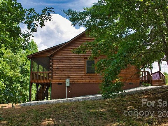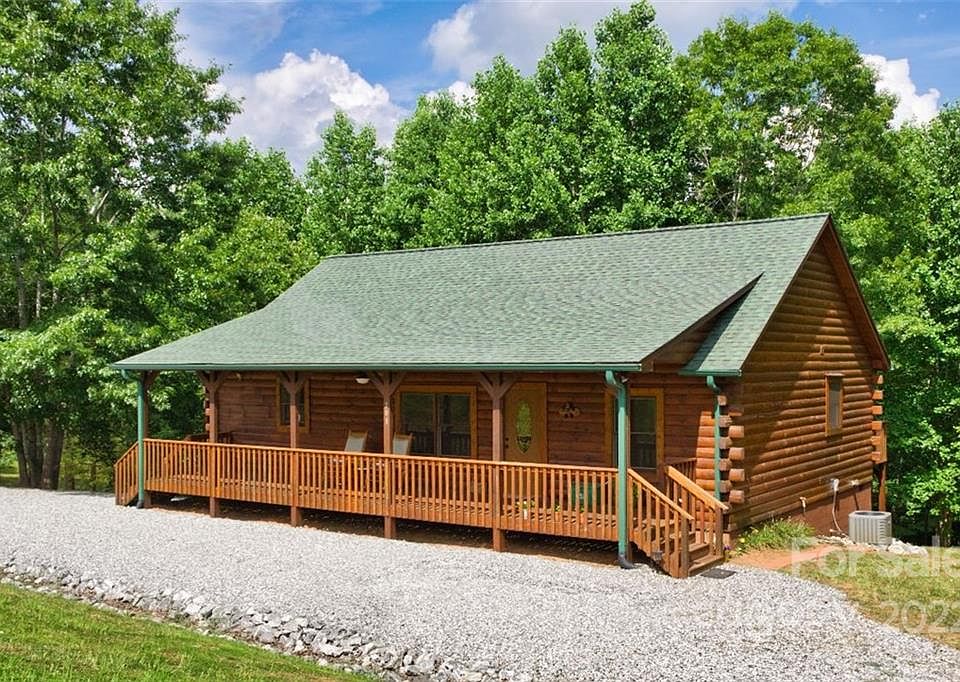 One-level, genuine log cabin on sloped lot is pretty much surrounded by trees. Behind it is 160 private acres. Deer, rabbits and wild turkey are seen regularly.
