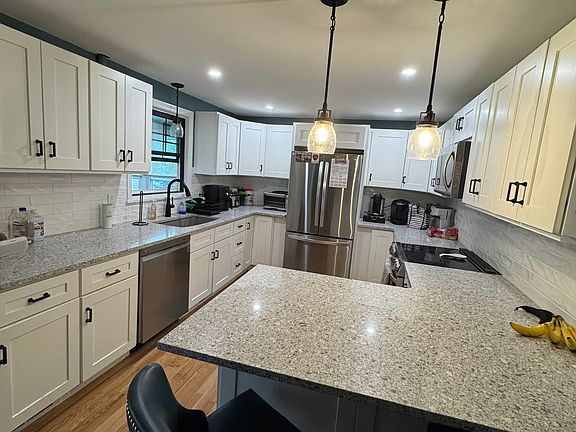 Renovated and furnished single family rental. Central AC. Spacious layout. Open kitchen and dining room combination with stainless steel appliances, quartz tops and hardwood floors throughout. Bonus room off kitchen can be used as home office or den. Lower level bonus rooms, full bath, and laundry. Outdoor deck perfect for entertainment overlooking private large fenced in yard. High-efficiency gas heating and cooling. Tons of parking with driveway and two car garage. Easy access to highway.