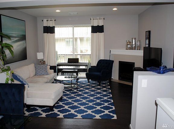 Pristine, move in ready with south facing lake views from every floor! Spacious 2 bd, 2 1/2 bath. Entry level has "fan"tastic Seahawks themed family room, or Den? with a 1/2 bath & dry bar. Attached over-sized 1 car garage. Light and bright kitchen has beautiful slab counters, stainless appliances, rich hardwoods throughout main floor, with a deck for entertaining. Come home to your quiet, gated community with its own private park, access to walking trails, and a spectacular , serene lake view.