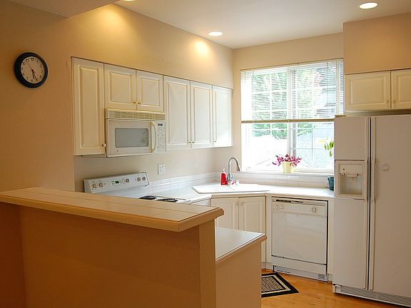 Upscale community of townhomes, one mile from I-90 and I-405; minutes to downtown Bellevue. Vaulted ceilings with 10-ft ceiling in living room, and skylights allow natural lighting to create a sunny, airy home. Open floor plan on main floor includes slider to spacious deck, mantled gas fireplace, and bright, sun-lit kitchen. Two large bedrooms each have a full bath. Beautiful master bath has double sink, granite counter, tile throughout, and double shower. Garage on lower level...