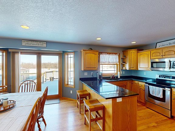 Wow! Custom one owner 4 bed/4 bath 2-story home with walk-out basement on the tee box of the 6th hole on the coveted Pine Island Golf Course! Just walk right out and start playing! This gorgeous home features New roof and New siding in 2022, in-ground sprinkler system, huge deck with awesome views, custom boulder retaining walls and fire pit, fantastic 10x20 storage shed, and so much lawn to enjoy! Inside you’ll surely appreciate the custom floor plan with vaulted ceilings, gas fireplace, granite countertops, hardwood floors, enviable primary suite with jacuzzi tub and double sinks, convenient mudroom with laundry, main floor office which could be a 5th bedroom, wet bar with refrigerator, and an additional den/office in the basement! It’s been years since there has been a home for sale on the Golf Course, don’t wait for the next one!