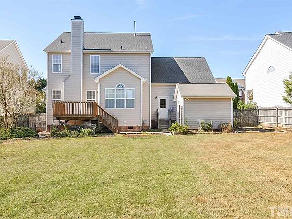 This Cary home offers a deck, a loft, a den, hardwood flooring, a fireplace, granite kitchen countertops, and a two-car garage.
