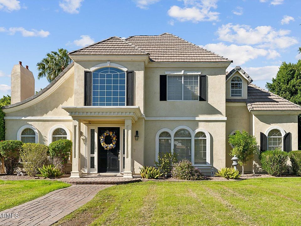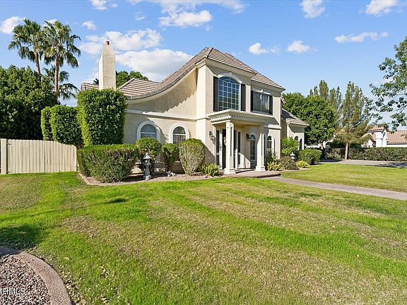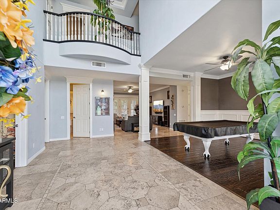 Welcome to the Mesa Groves. This amazing home has The quintessential Cottage Tudor home feel. The soaring ceilings in the grand entry way with tons of custom wood trim make this not your typical boring tract home. The sprawling lot is loaded with mature gorgeous trees and the home layout is loaded with storage space and has a great layout for a large family. 5 bedrooms, a lowerlevel master bedroom & Game Room upstairs with a walk out deck. Huge Kitchen with a center Island and eat up bar. Laundry room has room for 2 washers and 2 dryers. The resort like backyard is perfect for entertaining with a Pebble tec play pool, built in fireplace with large covered patio, and turf lawn. The extra wide 3 car garage has 3 separated doors and a storage room. Close to greenbelt and Loop 202 access.