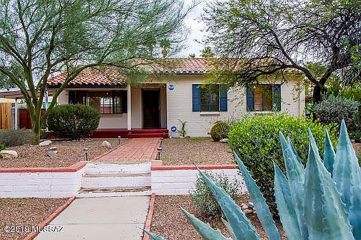 Darling bungalow, built in 1939, with a gorgeous walled backyard, mature landscaping front and back, carport & 2-car garage, w/d, with a studio attached (has full bath, no kitchen). So much character... you'll love the exposed beams, the rustic wood-burning fp, the gorgeous hardwood floors. Kitchen is spacious, with room for a breakfast table, and features original vintage stove and saltillo flooring. The backyard is truly an oasis, with covered patio, brick & flagstone, a fountain, raised garden beds. The 220 sf studio with full bath is attached to the garage... thinking Airbnb or home office? Best of all, you are a block and a half from wonderful eateries and coffeeshoppes, and just minutes to UA main campus, even closer to Banner Medical campus. Bikescore 90 & Walkscore 76.