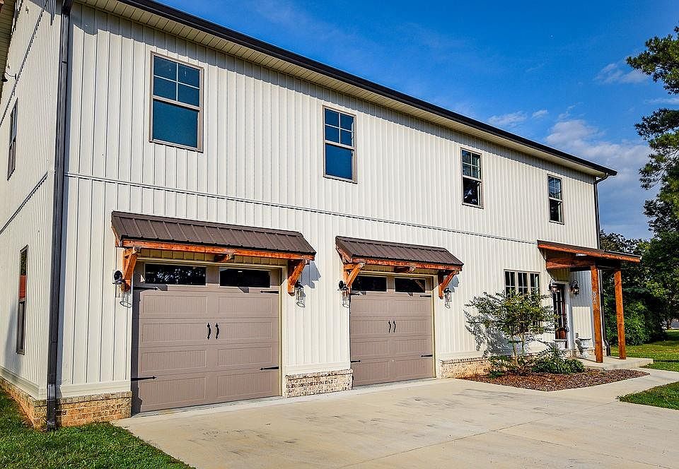 Modern Carriage House With Loft like feel. Located within the city limits of beautiful Cleveland TN. All of the main living in this Carriage House is located on the upper floor. The first thing you notice is cathedral ceilings throughout, open floor plan large kitchen with an 8' island with a beautiful repurposed barn wood top. The living room has a fireplace with a shiplap accent wall. French doors open to a 10x27' covered porch. Large master bedroom and En suite with 2 48” floating vanities with marble tops, water closet, 5' shower and separate tub. The EnSuite has 2 large master closets. There is also a guest room and full guest bath upstairs as well. Downstairs foyer has a board and batt grid accent wall also there is a 600 sqft flex room which is fully wired and plumbed for a 2 full k