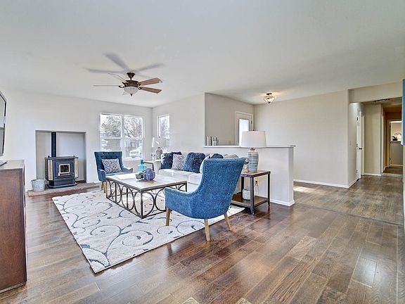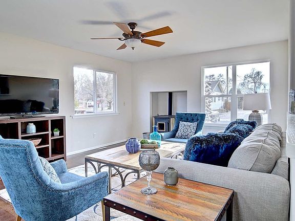 Master bdrm suite 15x25 with master bath soaker tub surrounded by travertine. Open concept media, living room with pellet stove and large, remodeled kitchen. New wiring, plumbing, windows and insulation. Tile baths and kitchen. Solid hardwood floors and carpeted bedrms. Large 2 car detached garage with wood stove.