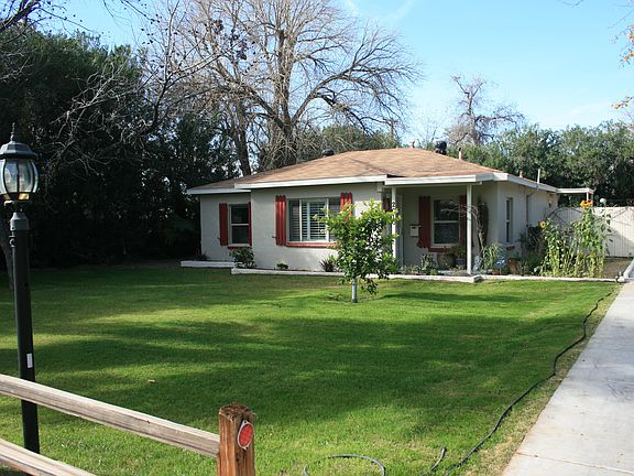 This Bungalow home has a feeling of enchantment. This historical home has many vintage features that retain the character of the property. The 1/4 acre lot is an oasis of garden with a 20ft high hedge surrounding three sides of the property. If you enjoy privacy, this home is for you. The rear yard is massive with a wonderful patio created with Belgard stone pavers, covered by an electronic Sun Setter awning. Sit around the stone brick fire pit and relax in privacy. If you enjoy fruit trees look no more, the property has Pecan, Lemon, Clementine, Apricot, Pomegranate, Fig, Peach, and vines consisting of Grape varietal. This flood irrigated property has it all.