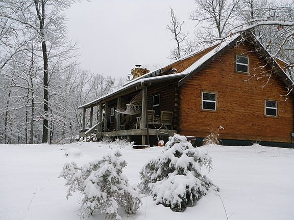 Custom built Red Cedar Log home. Open floor plan, 2 bedrooms on main floor, one in the basement. 1 Bathroom on main floor. Second bath subbed in in basement. Open loft on second floor. Vaulted ceilings through the entire house. All wood, no sheetrock wallboard. Basement storage and shop area, 4 car attached garage/shop. Tractor shed and wood shed. Wood heat, heat pump and electric heat for back-up. Large wood burning fireplace with insert, insert ducted to main HVAC trunk line, very good well. Also a 1000 gal rainwater catchment system for watering garden or back-up for well. Half acre pond stocked with channel catfish, year round spring, 6-8 acres in developed wildlife food plots. Borders 249,000 acres of Mark Twain National Forest. Blacktop road access with 1/4 mile driveway back in the woods, behind a ridge line. Bears, turkey, deer, bobcats and wildlife galore. House is all electric, my average electric bill is between $40 and $60. House is very efficient, very low maintenance. Lots of Dogwoods, Redbuds, Cedar, Pine, Hickory and Oak timber.