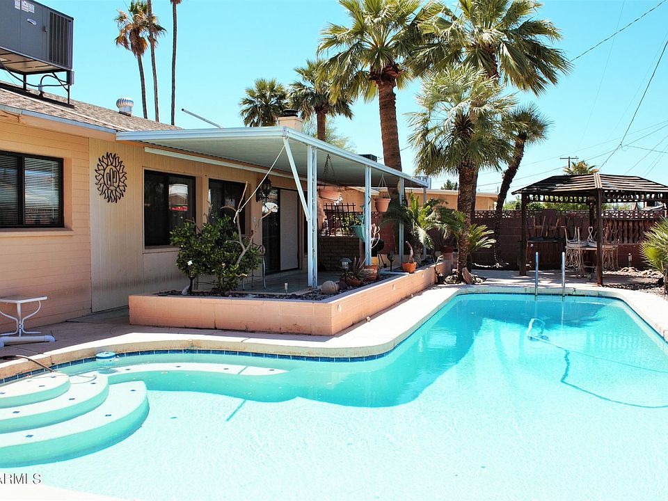 Well maintained 3 bedroom, 2 bath, 2 garage, Pool Home w/Solar on a quiet Cul-de-sac street of Moon Valley Gardens. Home features living room & family room. Separate breakfast room. All carpeting has been removed. Guest bath has double sinks with a separate tub/toilet room. Nice size master bedroom with walk-in closet. Master shower and hall bathtub have recently been renovated. Nice size 2nd bedrooms. Cozy fireplace in family/dining area along with a lovely brick accent wall & wood beams just make the room pop! Ceiling fans thru-out. Entertaining backyard with large covered patio that overlooks inviting pool and a wood pergola to accent your backyard. Gated side yard area for pets. You don't want to miss this one!