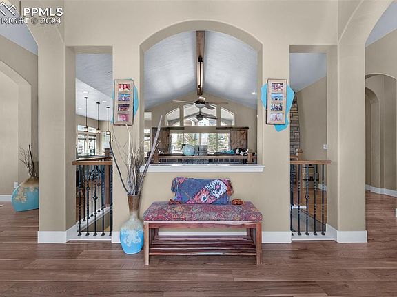 Located In The Upscale Flying Horse Neighborhood You'll Find The Distinctive 5 Bed Ranch Style Home With Fin. Basement On A Corner 17,031 Sq. Ft. Lot! As You Enter Home You'll See An Elegant Archway That Looks Into The Living Room. You'll Love The Open Level With Large Windows And Sliding Barn Door Patio Doors At The Far End And Luxury Vinyl Flooring! The Living Room Features Vaulted Beam Ceiling w/2 Drop Ceiling Fans, And A Majestic Gas Fireplace. Kitchen Features Granite Countertops, Large Center Island With Pendant Lights & Counter Bar, Pantry, Gas Range w/Hood And Attractive Backsplash. Surrounded By Windows & A Door To Patio In Back Is The Casual Dining Area. The Formal Dining Room Is At The Other End Of The Kitchen. The Carpeted Master Suite Enjoys 3 Large Windows That Look Out To Back Yard. An Adjoining 5-Piece Master Bath Has Tiled Shower w/Bench Seat And A Spacious Walk-In Closet. A 2nd Bedroom Is At The Front Of The Home & Would Also Make A Great Main Level Office. Washer/Dryer Are Included In The Main Level Laundry. Downstairs Is Carpeted And Features A Large Family Room With 2nd Gas Fireplace, Wet Bar With Wine Cooler And 3 Bedrooms. 2 Bedrooms Are Jack N Jill w/Double Vanity, Tub & Shower And Both Have Walk-In Closets! 5th Bedroom Enjoys A Larger Walk-in Closet And Enjoys A Very Nice Adjoining 3/4 Bath! Walk Onto The Covered 20 x 18 Patio From The Living Room & Enjoy The Peace & Serenity Of This Area. There's A Park Very Close To Home Also! The Home Also Enjoys Central Air, A Beautifully Landscaped Yard With Sprinkler System And Epoxy Floor In The 3 Car Garage. Located Near The Air Force Academy, Several Restaurants, Entertainment Venues And Views Of Pikes Peak Are Just A Few Of The Perks Living In This Desirable Neighborhood!