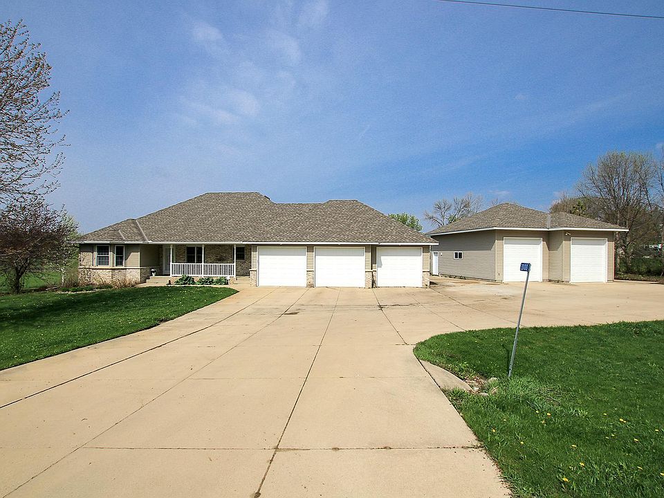5 Bed, 3 Bath Custom built home includes 3 car attached garage 36x30 and additional insulated and heated garage that is 28 x 30 and has a 1/2 bath. Raised panel doors throughout, granite countertops, surround sound in family room, 2 family rooms with fireplace in each, security system, and irrigation system. Open floor plan with Walkout lower level opens to beautiful yard. Located on the edge of town on 1.53 acres.