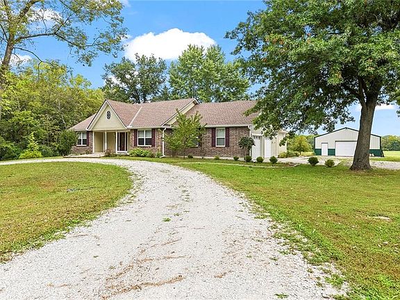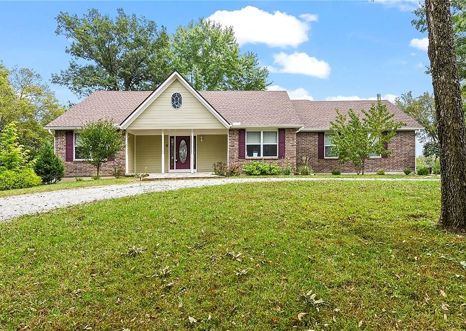 They say location..location..location...this one has it! A beautiful piece of property and very well maintained home close to town on 15.1 acres (much of it wooded). Just about a block off of blacktop. Come enjoy country living with the convenience of being close too, Harrisonville, Raymore, Belton, Greenwood, Peculiar and Lee's Summit. Newer items include: roof (5 yrs), HVAC, insulated garage doors and direct drive openers, septic tanks, dbl wall ovens, (a more complete list is in supplements). One level living includes new carpet in the primary BR (2 huge w/i closets leading into the laundry RM), fresh paint in the 2nd BR and lower level. The lower level is huge and includes a 4th BR (with egress), huge game room, plus another carpeted living area, full bath and a room to suit your own lifestyle, would make a great hobby/craft room or finish it out for a 2nd kitchen...could be a complete mother-in-law set up. There is a bunker (storm shelter) area...and it is a walk-out. Enjoy fishing and wildlife as there is a nice pond with a private dock. The 50X40 Metal outbuilding is complete with concrete floor and electricity (seller is leaving much of the shelving, air compressor & more (again see supplement to the SD for a complete list). The treed entrance adds to the charm of this country property. Don't miss it!