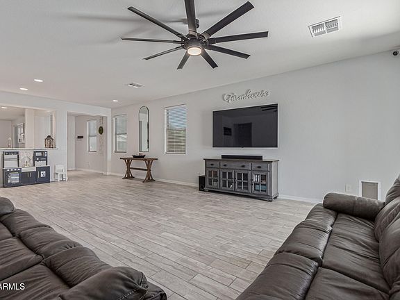 Located in Buckeye's Blue Horizons neighborhood, this impressive 4-bedroom, 2-bathroom residence features a 2-car garage and a spacious corner lot with an RV gate. The interior exudes refined sophistication, boasting an abundance of natural light, designer paint, recessed lighting, and wood-look tile flooring, complemented by carpeted bedrooms. The open layout and farmhouse-inspired design create a seamless flow. The kitchen is a culinary haven, featuring stainless steel appliances, generous wood cabinetry, a pantry, and a chef's gas cooktop. The main bedroom boasts an en-suite with dual sinks and a spacious walk-in closet. The exterior presents a covered patio, artificial turf, and expertly laid pavers, providing an ideal setting for a pool. Just minutes from the I-10.