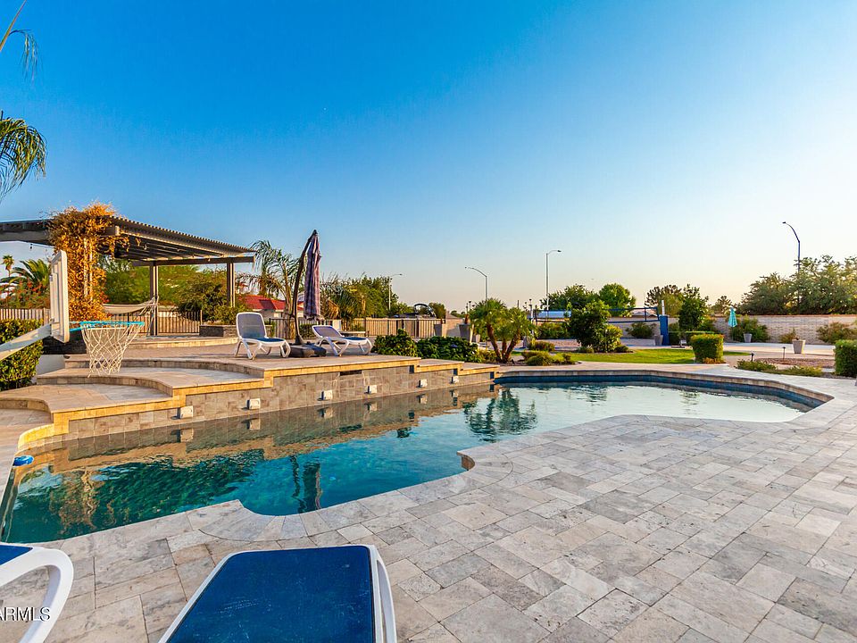 Talk about an incredible opportunity! Over a HALF ACRE entertainer's paradise conveniently located in Mesa--gated community with no rental restrictions! Industrial farmhouse styled home w 5 spacious bedrooms, including a downstairs bedroom, and 4 full bathrooms. RARE BASEMENT + main floor bonus area and TONS of storage in this very livable floorplan. Is outdoor living more important for you? Backyard is a gem with a pool, raised pergola and grill, sand volleyball court, paved basketball court, and lush landscaping! RV gate is a bonus for additional storage and property access complete with a paver pad. Don't miss out on this beautiful move-in ready home.