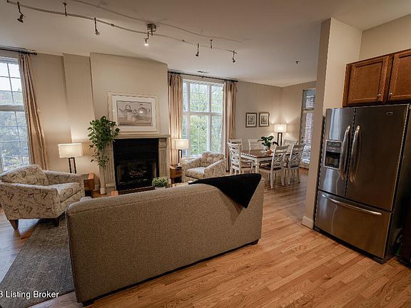 Desirable corner unit with 7ft windows flood the rooms with natural light. Tall ceilings give spacious feel, the main room is great for entertaining. Main living area has wood floors refinished in 2020, gas fireplace, and private balcony. The kitchen has 42'' cabinets, stainless appliances, and black granite countertops. Both bedrooms are carpeted. Wash and dryer remain. Dryer is one year old, HVAC new in 2020. Clifton Lofts has two elevators (one cargo sized for easy moving), secure fitness room and mail room, rooftop terrace on 4th floor, and a lovely shaded courtyard. There is an assigned parking space and parking available for guests. Convenient location is only 5 minutes from downtown and waterfront park and near major highways. Frankfort Avenue is known for its excellent restaurants,