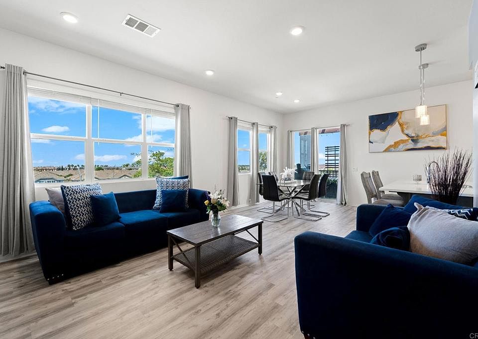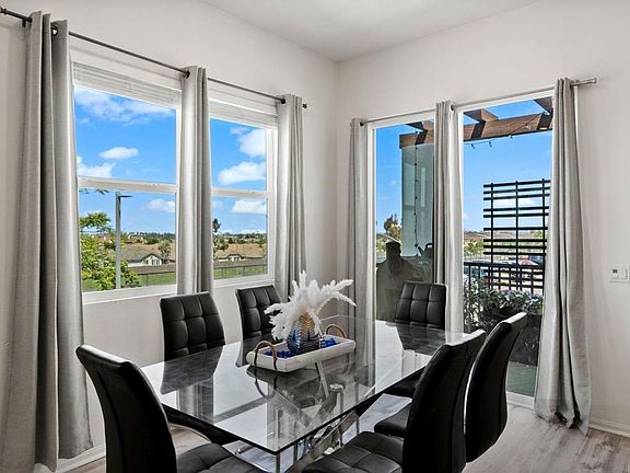 The Condo you’ve been waiting for! In close proximity to restaurants, a dog park, shops, and entertainment at Otay Ranch Town Center in Chula Vista, this spacious three-story end-unit condo invites you to feel right at home the moment you step inside. Bathed in abundant natural light, and unobstructed views from the living room windows all the way to downtown San Diego, this property exudes warmth and charm and openness. This lovingly maintained home features a decorative entry door and super high ceilings on the main floors. The kitchen complete with a large island, newer stainless steel appliances, and a spacious balcony, is perfect for relaxing on hot summer days with the protection of elegant curtains. From the balcony, enjoy stunning mountain views on clear days, creating that lovely open feel. Carefully selected flooring on the main floor complements the personally selected backsplash, beautifully highlighted by stylish bar lighting. The spacious primary bedroom on the third floor is filled with natural light and offers a comfortable, spacious walk-in closet with double vanities in the bathroom. The other bedroom on the third floor also has a double vanity ensuite bathroom. With a two-car garage, and additional storage space in the garage which could be converted into a unique small office space, ample guest parking close to the condo, this home provides a unique and serene setup! The community has a heated Pool, Spa, Fitness Area, Pickelball Court, BBQ and Recreation areas, Dog Run and Tot Lot. Don’t miss out on an amazing opportunity to make this beauty yours.