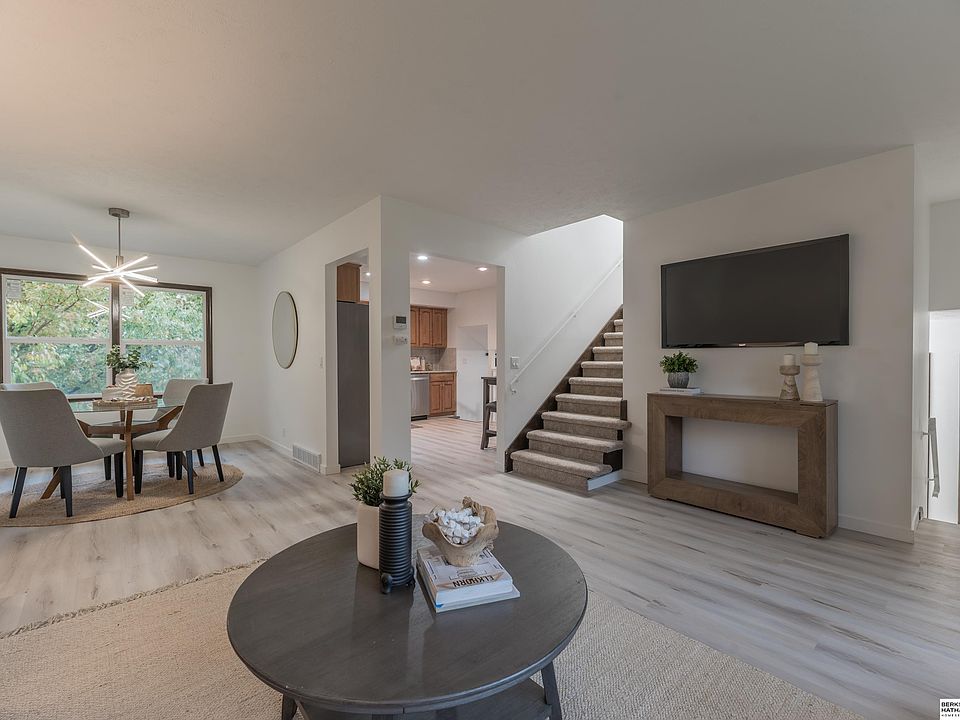 Beautifully remodeled Meadowview home near 100th & Blondo! Step inside to all-new flooring, fresh paint, and several new windows. The kitchen impresses with quartz counters, tile backsplash, and brand-new stainless steel appliances. All three bathrooms shine with new flooring, vanities, countertops, lighting, and tile. Crisp new trim throughout adds a modern touch. The cozy family room with fireplace opens to a freshly painted deck overlooking mature trees. The walk-out lower level offers extra living space with an egress window and laundry room with sink. Enjoy the fully fenced .32-acre lot, oversized garage with built-in shelving, and a prime location near the Dodge Expressway, Westroads, dining, and schools. Move-in ready and beautifully updated!