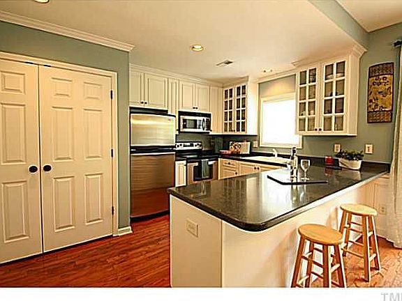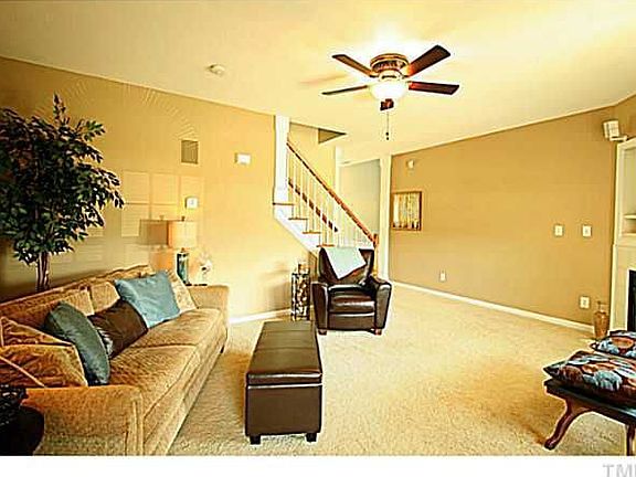 Look no further...great N Raleigh location, move in ready! Gourmet kit w/ss appliances, glass door fronts, corian counters! Hrdwd flrs! Liv rm w/gas fp! 2 master suites! One with 2 w-i closets, jetted tub! Upgraded tile baths! Oil rubbed bronze fixt t/o! Private fenced patio backs to open space + treed buffer! Easy access to pool across street! Dues include H2O, trash/recycle too!