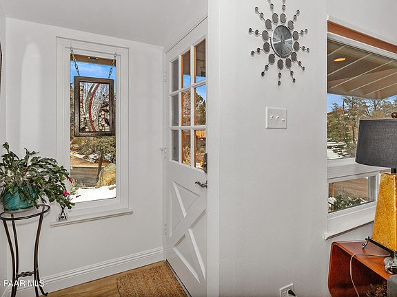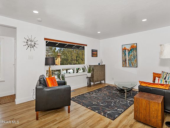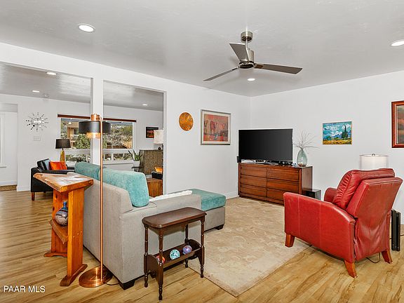 Amazing Mid Century Modern Home in a wonderful hard to come by, and a locals favorite neighborhood, just minutes to Downtown Prescott with NO HOA. Recently UpWalk up to the Large Bright Living Room with hardwood Floors and loads of natural light. The home is full of charm at every turn! The family room is open to the the kitchen and Dining room that offers an original built in cabinet for display and don't miss the brick beautiful fireplace. Amazing recent Master suite update. with beautiful Bath and walk in closet. Wonderful office or private guest suite just down the few stairs. Recently updates include newer roof, tankless hot water heater, 3 solar tubes. Fruit trees, Boulders, Mountains and front offers a Circular Drive