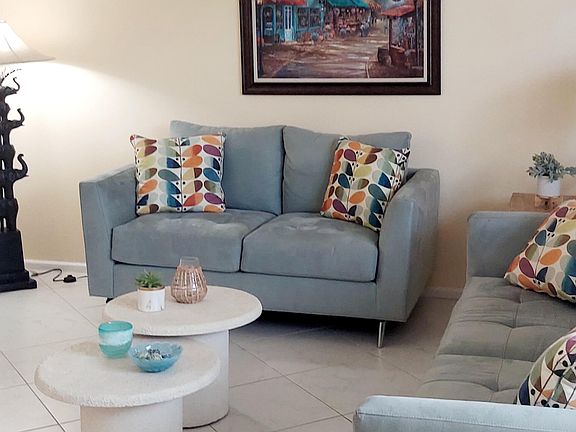 Annual or 6 month seasonal rental ! 55 plus community! This is the one! Discover your MOVE-IN -READY RENTAL, 2nd floor 1 bedroom 1.5 baths home in Century Village Boca. Adorable, well-furnished for annual or seasonal six-month rental Come into your beautiful well furnished condo, The condo boasts a lanai with breathtaking water views. Enjoy the open concept of a big living and dining room space.