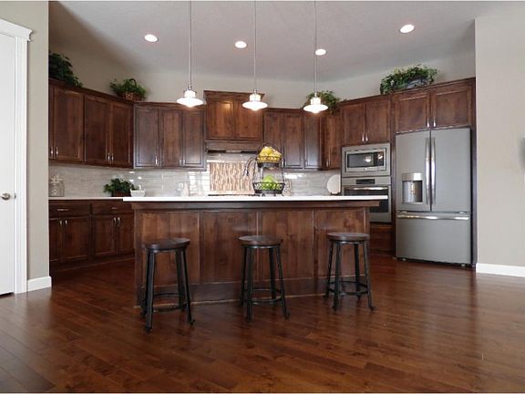 Custom built Rambler features all living space on one level. Gourmet kitchen with custom cabinets, quartz tops, SS App, HW floors, tile backsplash, and an enormous island. The family room with FP is open to the dinette and kitchen that makes this floor plan great for entertaining! Large master suite with beautiful walk in shower and huge W/I closet.