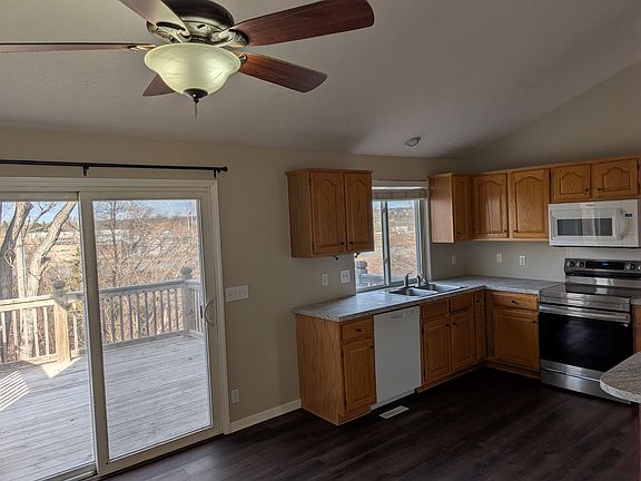 The home features 3 bedrooms and 2 bathrooms with a desirable walk-out layout. The spacious master bedroom includes a private bath with double sinks, while vaulted ceilings in the primary bedroom, living room, and kitchen create an open, bright, and inviting atmosphere throughout.