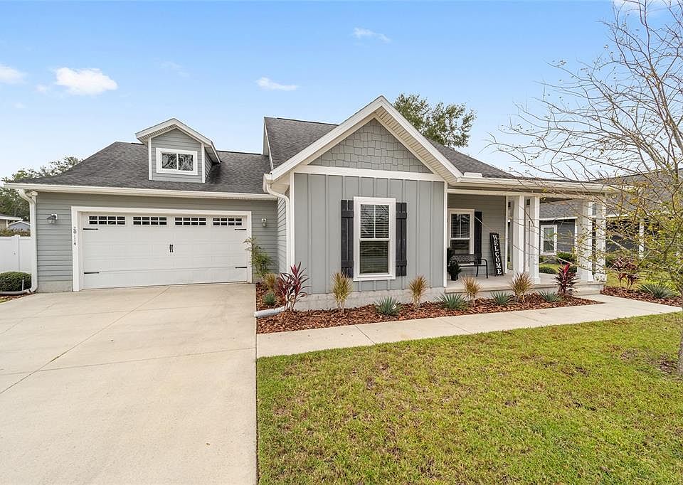 This darling craftsman home is situated on a premium lot that backs to .6-acre HOA common area in the sidewalk community of Laurel Pointe in Spanish Gates. Gently lived-in, this second owner home was built in 2017. With 1845 SF of heated and cooled space featuring a two-way split floor plan, this charming home has three bedrooms and two baths. The home is loaded with custom detailed finishes, which is immediately noticeable once you step inside the front door. With a true foyer, this space is perfect for the convenient drop-zone for your laptop bags and backpacks. Once past the foyer you will realize why this the open-concept floor plan was one of the most popular plans for the builder. The entire length of the family room wall features floor-to-ceiling custom shiplap, giving this space a finished designer look. Multiple windows overlook the covered lanai, rear yard and common space beyond. The open kitchen features pretty white custom wood cabinetry complete with a classic design element – cabinetry crown molding. Additional features include an all stainless-steel appliance package, granite counters, a center island with a dual basin sink, and a modern commercial style faucet with an open-coil spring spout with pull down sprayer. Its swivel adapter has an extended range of motion all around the sink for easy cleaning. Finishing this space is the separate pantry. Adjacent to the kitchen is the spacious dining are that overlooks the rear yard. The perimeter of this room has modern wainscoting; with the wood slats on the ceiling defining this dining space. The master bedroom has an en suite bathroom with granite counters and a double vanity, a European style walk-in shower, a separate water closet, and most importantly…a walk-in closet that has the size and space you’ve been wanting. Off the opposite side of the kitchen is a niche that is perfect for a desk/computer/office area, a double door storage closet, and the guest wing of the home. Both guest bedrooms feature double door closets and carpet; both share the full hallway bath. The whimsical laundry room will make doing laundry enjoyable. The owners installed a wood shelf for over-appliance storage; there are two cabinets that have open shelves in between for additional storage, and a hand-painted stencil wall for that touch of whimsy. Access the covered lanai via the family room French door. The lanai has a new tongue-n-groove ceiling; with the cooler nights coming soon, you will love to dine outdoors or simply relax in this space to enjoy the westerly sunsets just past the common area that abuts the rear of the lot. Additional home features include modern vinyl plank flooring in the living spaces, including the foyer, granite counters throughout, a charming wrap around front porch, an attached 2 car garage, a long driveway for easy guest parking, an affordable $40/qtr HOA fee, and a location that can’t be beat. Laurel Pointe is located in the heart of High Springs, just minutes from the High Springs Community School and the quaint downtown High Springs area where you will find shopping, restaurants, and coffee shops; and is less than 10 minutes is the Alachua Publix shopping area. Simply do not wait on new construction to be finished OR pay new construction prices when this property is ready for you to call it "home".
