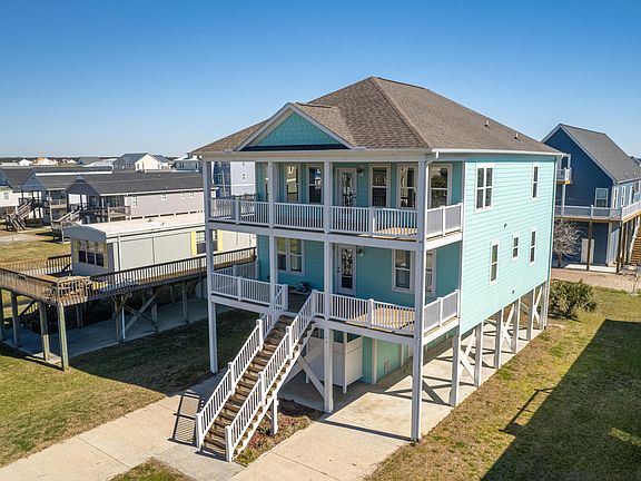 Custom FIVE BEDROOM home in the tranquil canal front subdivision of Old Settlers Beach in sunny Surf City. Beach access is directly across the street, 2 blocks from the home. Relax on the two covered decks and take in the expansive views from the ocean to the sound. Haul everything you need for your beach trip upstairs in the indoor elevator, and store items in one of your two ground floor storage spaces. Enter the top level through the stunning front staircase or use the wet weather entry on either side of the carport downstairs. The second level has 4 oversized bedrooms with jack and jill bathrooms on either side of the dual bedrooms. All bathrooms have granite countertops with tile flooring and double sinks, so everyone has their own space! Laundry closet in the hallway on this floor for convenience. The top level has an opulent trim package complete with columns and plenty of windows for added brightness. Off of the elevator, walk into the large master suite with vaulted ceilings and a private bathroom with a shower/tub combo and a walk-in closet with wood shelving. Walk out of the master, into your custom and fully equipped kitchen with a walk-in pantry, an island, soft close cabinets and drawers, granite countertops, stainless appliances and fresh white cabinetry. Kitchen also has a half bath for guests. The open floorplan then leads to the expansive living room with a gas logs fireplace. The top deck is perfect for entertaining with beautiful hardwood ceilings. Inside the home, the bedrooms are carpeted for comfort, bathrooms are tiled, and the rest of the home has REAL hardwood floors; a rarity at the beach. Wash off in the outdoor shower after a day on the beach. Home is a short walk to the friendly mart, and several bars and restaurants in either direction. Would be a rental powerhouse because of the layout and space, but also perfect for a primary or secondary home because of all the custom features and attention to detail!