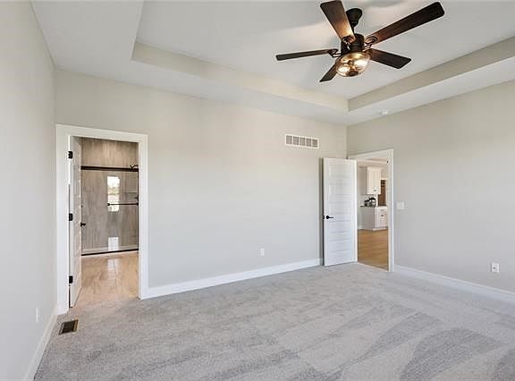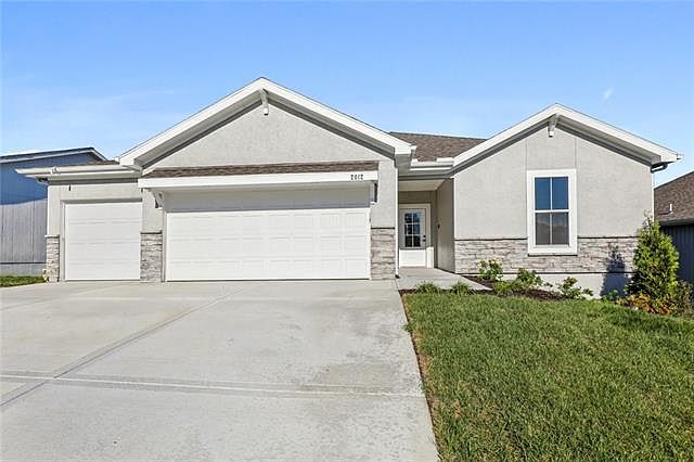Beautiful ranch plan in Alexander Creek, Raymore's premier 55+ maintenance Provided community. Everything you need on one level & upgrades galore! This one has no steps going into the house from garage. Main areas have luxury engineered flooring. Quartz counters in kitchen and both bathrooms. Kitchen has stainless appliances with gas stove/range, great custom cabinets, plenty of counter space, and large pantry. Great room has fireplace with upgraded tile surround. Master suite has large bedroom & bathroom with double vanity, custom tiled shower, and large walk-in closet. Unfinished basement is stubbed for bathroom.