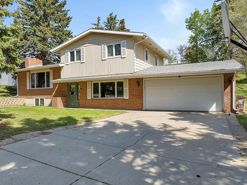 Check out this spacious home in NW Minot!  Immediately you will be charmed by the quiet cul-de-sac, mature trees, and great location of this house.  Between all 4 levels, this home is over 2,000 square feet, and has a lot to offer!  Walking in and going up takes you to the living room, kitchen, and dining area.  There is an electric fireplace in the living room, plenty of cabinets in the kitchen and ample natural light.  The dining room has a sliding door to the backyard deck, which is perfect for summer BBQs!  On the top level, you will find a full bathroom, 3 bedrooms, and original hardwood floors.  The primary bedroom has a 3/4 bathroom, and there is a large linen closet in the hallway.  Going back down to the entry level, there is a large mud room (or flex room) with access to the garage, and another bedroom with a 3/4 bathroom and a door to the backyard patio.  Going down to the final level is a family room, and laundry/utility room.  Both rooms have plentiful storage space! Outside there is an amazing deck, a brick patio, a shed to keep your seasonal tools, and a very private feel.  With some TLC, you can make this home your own!  Don't miss out, call your favorite agent today!