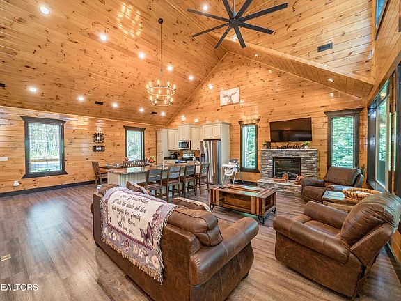 Just off Wears Valley Rd, approx 12 min from The Island in Pigeon Forge this large cabin comfortably sleeps 12 and is loaded with incredible amenities. With an indoor swimming pool, pool table, multiple video games and home movie theater. Arrive at the cabin with ample parking for up to 4 cars! Parking will be a breeze! Walk the large bridge to the covered front porch. The main entrance of the cabin enters into a huge open floor plan that combines a fully equipped kitchen, a dining area and a living room. Large windows give way to wooded and mountain views! The large living room area features a stone fireplace and a wall of windows to bring the outdoors in. A wonderful covered porch is just outside for relaxing and to help you enjoy the Smokies! There are 2 private master suites on this level. The lower level offers you a game room, theatre room, a covered deck featuring a relaxing hot tub, a bedroom with customed built bunk beds and your own private indoor 10 X 15 Foot pool!!!!!