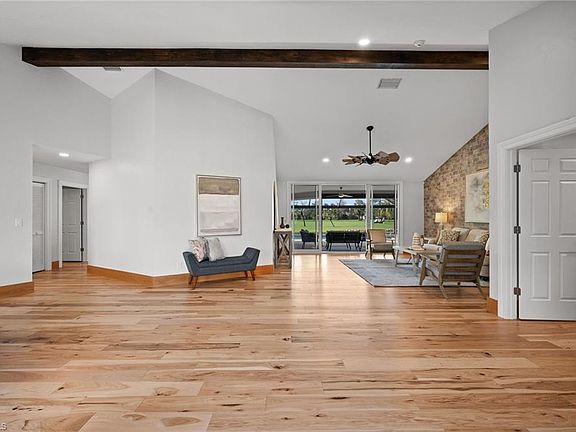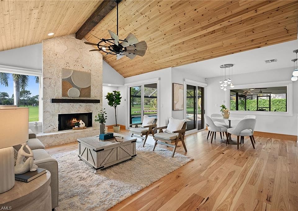 Prepare to be captivated by this meticulously remodeled home, featuring over $370,000 in recent upgrades! Boasting 4 bedrooms and 3.5 baths, this residence offers over 3,000 SF of luxurious living space. Situated on a cul-de-sac lot spanning over half an acre with 230ft of frontage on the golf course and sweeping golf course views. The interior exudes modern elegance, with quartz counters, custom cabinetry, new high-end appliances, and wide plank hickory wood flooring throughout. Designer finishes, a soaking tub, and generous closets/storage add to the allure of the home. A spacious laundry room, coral stone fireplace, hurricane impact windows and doors (including garage), full home generator, custom lighting and custom hardwood impact front door further enhance the appeal. Step outside to the expansive lanai, featuring a large covered area and a picture frame screen enclosure, creating an ideal space to relax and entertain. The pool with a sun shelf beckons for leisurely afternoons of enjoyment. This home is a true gem, offering a harmonious blend of luxury and comfort. Don't miss the opportunity to experience the unparalleled lifestyle that awaits within this exquisite property.