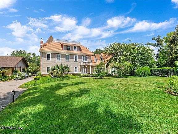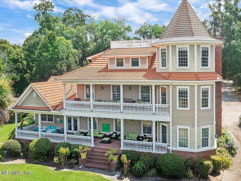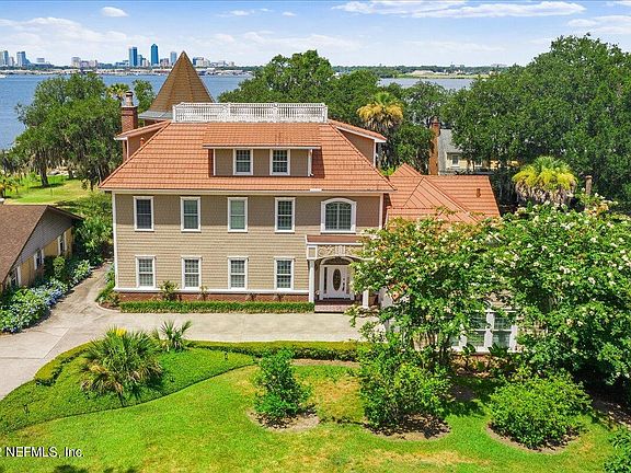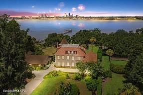 details and finishes which harken back to when architects were truly ''master builders,'' and when design and construction were more tightly integrated. An imported Italian tile roof complemented with an additional octagon copper turret, 3 HVAC's and 4 water heaters. Stepping through the leaded-glass front door with side lights and transom, you will be greeted with ¾ Santos Mahogany floors flowing hout the main floor, landings and stairs. 10 foot ceilings, 10 inch baseboards and three -piece dentil crown molding adorn the home. At the left of the entry is the distinguished office with rich, custom-built bookcases, stained and encased windows, stained wainscoting and crown molding, recessed lighting and disguised floor plugs. To the right is the inviting dining room with recessed lighting, chandelier, white wainscoting, chair rails with picture frame molding and recessed area for displaying your treasured art piece. The dining room is enhanced with an impressive wood tray ceiling. The gourmet kitchen will be the envy of all your friends - custom cabinetry throughout with endless drawers, another stained wood tray ceiling, recessed lighting, and an oversized island/breakfast table complete with wine chiller and warming drawer. In addition, Zodiac counters, farm sink and top of the line appliances check out the Thermador range/oven and Sub Zero refrigerator as well as kitchen planning/work center complete with miniature TV! The laundry room provides a multitude of storage options with floor to ceiling cabinetry, zodiac counters, dual sink and tile floors. The Gathering/Living room is located just off the kitchen with access to the covered porch, rich wood floors, dentil molding and one option for where you can view the most beautiful sunsets in Jacksonville. A small powder room boasting a pedestal sink, marble-tiled shower and floors. The enormous Great/Family room is an astounding 789 square feet with opulent wood floors, molding, encased windows, wood burning fireplace (with gas line option), custom wood mantle, ceiling fan and bay windows proudly displaying views of the yard rolling to the river. The second level has the primary suite and two guest bedrooms, one with a river view and the other with a garden view, and both generously sized. These rooms both all have en-suite baths and mimic the same architectural wonders found on the first floor - from impressive molding to prized marble floors to resplendent river views. The Primary bathroom is equipped with a marble-tiled shower, marble floors, jetted jacuzzi tub and a stained glass accent window with oversized vanities and lots of cabinet space. Finally, there's the 3rd level (with 2 more bedrooms - closet systems remain with home) where you can use your imagination to configure this spacious area to your family's needs. Ceiling fans, encased windows, dormer storage enclosures and one full bath. Could be a movie theater, a work room, play room, or just extra space! The "Turret Room" is astounding with rich mahogany flooring and an octagonal wood ceiling and chandelier - all with an incredible view of the St. John's river. Pull the stairs down and climb up to the roof terrace to view the intermittent celebration fireworks or simply just to take in nature's uninterrupted beauty! The backyard slopes gently to the river - path between the two houses and the dock (as/is - damaged during the hurricanes) is solely owned by 2012. Mature trees offer shade and a quiet place to sit. Blossoming garden full of colorful flowers and the ability to pick fresh lemons, limes and papayas! Plenty of room to add a pool and a myriad of other possibilities! Single family home to left is a separate parcel and NOT included. Some furniture may be available for purchase separately.
