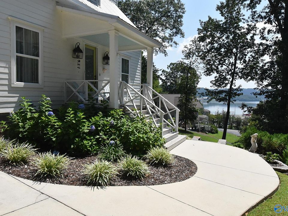 Enjoy year-round views of Lake Guntersville from this curated & well-maintained 3BR, 2.5BA cottage. The exterior features low maintenance Hardie plank accented with a corrugated metal roof for lake town appeal. Interiors of the main level open-concept living/kitchen area offers a welcoming flow accented by a fireplace, wood floors, and 9-foot ceilings, adding warmth and style. Roomy primary suite is conveniently located on the main floor. A beautiful staircase leads to additional bedrooms, full bath, and generous walk-in attic storage.Perfectly positioned on the peninsula, this home offers both privacy and convenience—just minutes from walking trails, schools, shopping and boat launch.