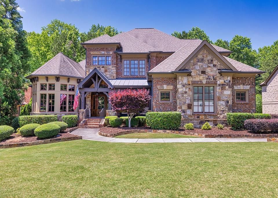 Nestled in Sought After Stonewater Creek, this 4-side brick, 3-car garage custom home embodies traditional elegance. This home is only one of seven custom homes built in the community. A refined entrance offers the first views of a beautiful formal dining room, while across the hall is a dedicated home office with many windows, which sets the stage for both productivity and comfort. At the heart of the residence, a two-story great room extends an invitation to unwind, seamlessly connecting to a covered veranda that boasts views of a wooded backyard. The designer kitchen is a culinary haven, featuring a central island adorned with granite countertops, professional-grade appliances, stylish cabinetry, and an elegant tile backsplash. Adjacent to the kitchen, the breakfast room creates a warm, inviting space for morning gatherings. The keeping room with a fireplace provides a place to relax and reflect. The main level primary bedroom suite offers a luxurious retreat with a sitting room and a spa-inspired marble bathroom featuring a jetted tub, a large walk-in shower, and dual vanities. The home's thoughtful layout includes three en-suite bedrooms and a bonus room on the upper floor, accessible via a central staircase. The terrace level is designed to entertain and impress, hosting an open-concept media room, an additional guest suite, and a second office dedicated to privacy and focus. Enjoy relaxing on the weekend in the community, playing tennis, or enjoying the Olympic-sized pool with a slide. The clubhouse offers tons of space for entertaining. This magnificent home blends sophisticated design with ultimate comfort and luxury, offering an unparalleled living experience within the community. The Sellers are meticulous and have maintained this home to the highest degree. It is in a prime location close to Mill Creek schools, shopping, golf courses, and I-85.