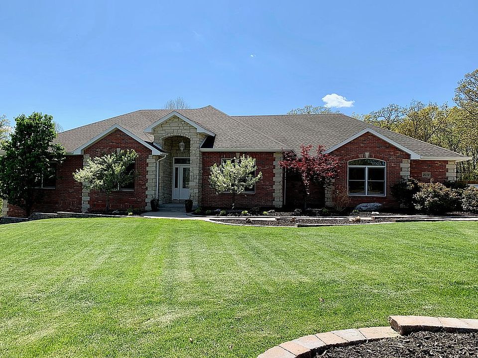 Beautiful all-brick home in Whitney Woods Subdivision. Freshly sealed hardwood floors throughout main level, tiled basement (carpet in all bedrooms). Kitchen features custom cabinets, stainless appliances, granite, breakfast bar & nook, walk-in pantry. Master Bedroom Suite with jetted tub & huge walk-in closet. 2nd master bedroom with private bathroom on main level. Office can be conforming 6th bedroom. Finished basement with 10' granite wet bar & wine storage room. 26 x 20 John Deere room/workshop & storage galore. 2 Bedrooms down, 12.9 x 12.5 and 12.9 x 12. Fully fenced yard with custom stamped-concrete patio, composite decking, sprinkler and soaker system. Bali custom blinds throughout, surround sound, and fresh paint inside. Quality construction.
