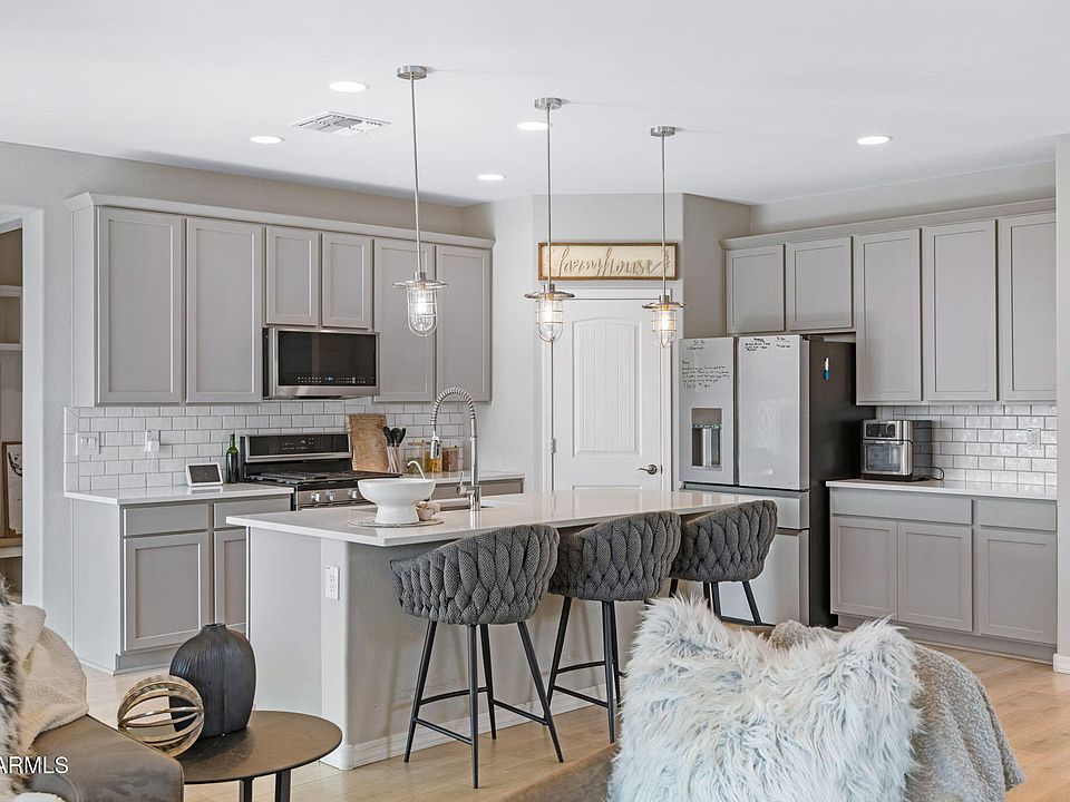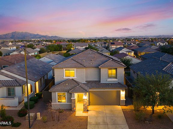 Bring ALL offers—motivated seller! Highly upgraded Pulte home in the sought-after Blue Horizons community offers modern comfort and flexibility. The open-concept design features a versatile loft perfect for a bonus room, home office, or future 4th bedroom. The kitchen shines with subway tile backsplash, gas range, built-in microwave, abundant cabinetry, and a convenient desk/workspace. The primary suite includes dual sinks, a large shower, and walk-in closet. Enjoy a spacious laundry room with extra storage and a lush backyard with vibrant grass, raised garden boxes, and mature citrus trees—perfect for relaxing or entertaining under the covered patio. Assumable 3.3% VA loan available. Seller offering 2% contribution toward a permanent rate buydown or 2/1 temporary buydown (approx. $9k). Blue Horizons is a thoughtfully planned community in western Buckeye, offering a welcoming and family-friendly environment with modern homes and carefully designed amenities. Residents enjoy neighborhood parks, ramadas, sports courts, soccer and baseball fields, and scenic walking trails, providing opportunities for recreation and outdoor living. The homes feature elegant Ranch-style architecture, spacious layouts, and inviting outdoor spaces that complement the surrounding landscape.