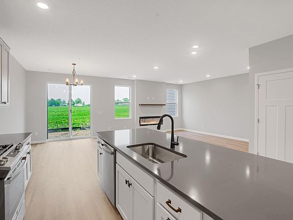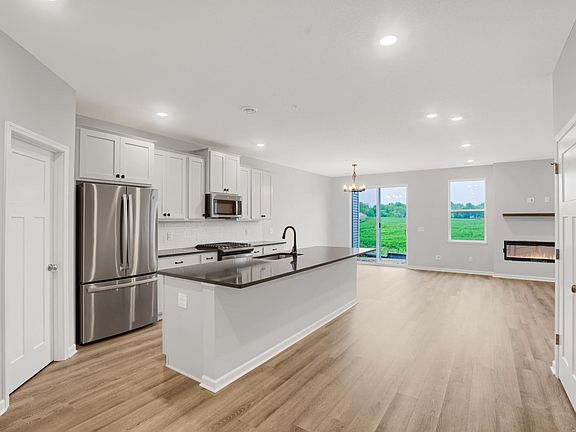 There’s so much to love about this stunning, ready-now townhome! You can expect to find 3 bedrooms, 2.5 bathrooms, and a 2-car garage. Head inside through the front door where a coat closet sits just off the foyer and the steps to your second floor are straight ahead. Take a couple of steps forward and you’ll immediately find yourself in the heart of this home. The kitchen, family room, and dining room flow together seamlessly. Highlights in this kitchen include stainless steel appliances, a spacious corner pantry, and light gray cabinetry with matte black hardware and crown molding. An electric fireplace offers a striking focal point in the family room. Head up to the second floor where a loft and the door to your owner’s suite greet you at the top. The en-suite bathroom has 2 sinks, a linen closet, a private water closet, and a spacious shower. Located on a highly desirable lot with pond view! Come visit and fall in love with this luxurious designer level Townhome that is a MUST SEE
