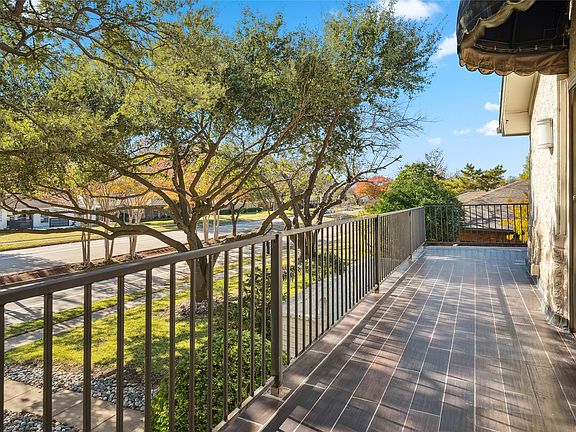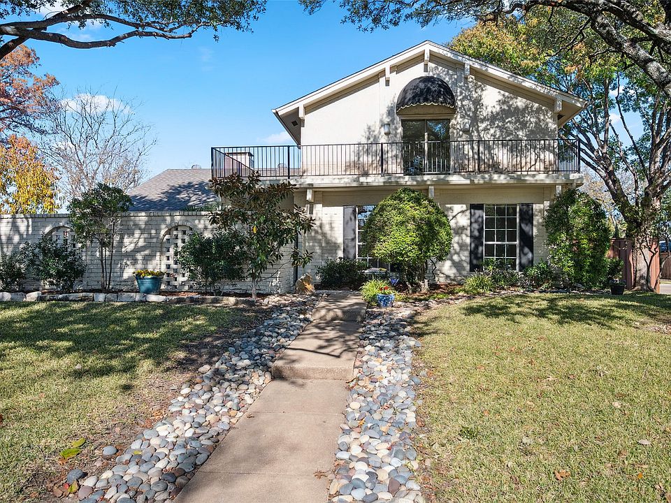 Large corner lot home nestled in Richardson's coveted Duck Creek neighborhood! This 2596 sqft home boasts wonderful curb appeal with the mature shade trees and beautiful landscaping. One of many outdoor sitting areas, walk up on a scenic and private courtyard, perfect for your morning coffee retreat. Inside, step into ample space with two living areas - engineered hardwood floors, a fireplace and vaulted ceilings anchor the first, while a wet bar and recent carpet (Dec 2025) accompany the second living room. Make it a family affair in the kitchen with spacious granite counters and all stainless steel appliances. The dining area boasts great natural light with engineered hardwoods and decorative lighting. Just off the kitchen, enjoy a guest bedroom that could fit the bill for a in-laws suite with a full bathroom within reach. Upstairs, the primary bedrooms ensuite features earthy tile shower surround, a separate tub and updated 8-light vanity. Step out onto the expansive front balcony providing a panoramic view of the front lawn and neighborhood. Extra bedroom upstairs is large enough to be a second primary bedroom with ensuite bath, and nice walk-in closet along with its own private balcony. Out back, full glass surround sunroom pours light in. Freshly stained board on board fence wraps the yard in privacy. Hosting here is made easy with the open floor plan and abundant space! Located within a short walk to Dartmouth Elementary, Huffhines Park, and many walking trails, this home is begging you to get outside and enjoy the community.