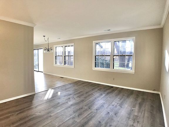 Centrally located, updated open concept ranch home with dual living spaces, foyer, masonry fireplace, screened in porch, new landscaping, huge private fenced backyard with fire pit and gorgeous views of wooded creek. Freshly painted interior with all new lighting and crown molding throughout; new luxury vinyl plank flooring; porcelain tile floors; updated bathrooms with all new finishes and fixtures; updated kitchen with granite countertops and all new stainless steel appliances; washer/dryer; oversize 2-car garage with extra storage area; wood burning fireplace piped for gas. Showings will be scheduled on weekends and at anytime/day in the week of June 8 - 15. Renter is responsible for all utilities and yard maintenance/snow removal. No smoking in house. Pets allowed with extra $1000.00 deposit.