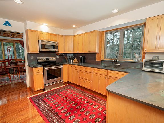This home boasts numerous upgrades, including a gourmet kitchen—a hub of activity—showcasing granite countertops atop shaker maple cabinets, high-end stainless steel appliances, hardwood floors, a generous pantry, and soaring cathedral ceilings over the adjoining sitting room. After a day of outdoor adventures, all will want to gather in the warm, inviting, and expansive front-to-back living area where there is a crackling wood fireplace, amidst exposed Maine timber beams, a west facing bay window, and rich oak flooring. The formal dining area seamlessly connects to the screened porch, perfect for enjoying morning sun & coffee amidst the tranquil surroundings.