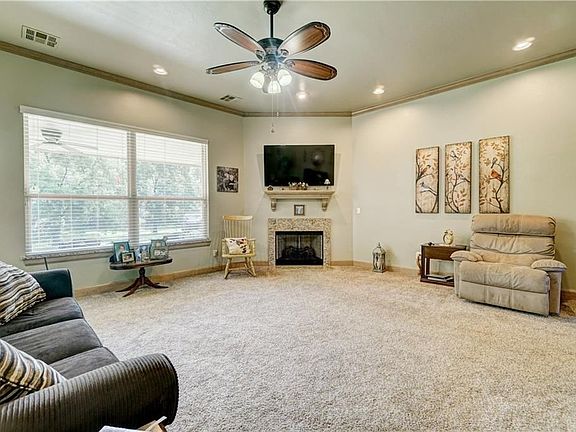 You're going to want this 4 bedroom home on a cul-de-sac and greenbelt! Meticulous care and attention to detail are evident throughout. From the back patio you can enjoy pond views and a beautiful greenbelt where deer and turkey frequently play under the large shade trees. You can also walk over to the workshop to complete your projects or sit on the covered deck to watch kids play. Inside you will be impressed with the light custom paint/stain colors throughout and tall ceilings. The living room has large windows to bring the pretty views inside, and a corner fireplace for cozy nights. The kitchen has stainless appliances, granite counters, tile backsplash, an island with breakfast bar, full pantry and is open to the living room so you won't miss anything while you cook. The master bedroom is the perfect roomy retreat with soaker tub, separate tiled shower, dual sinks, and his & hers closets. 3 more bedrooms, extra garage space for storage and in ground storm shelter in backyard!
