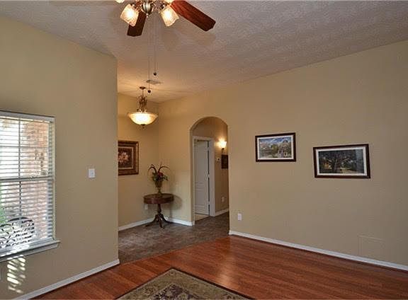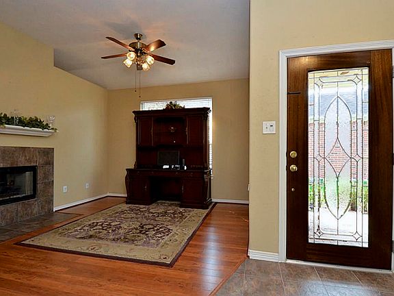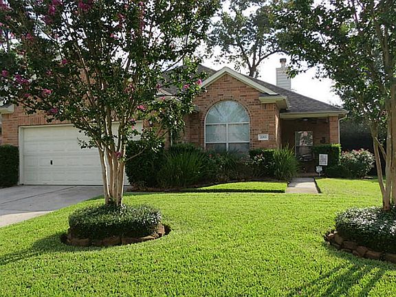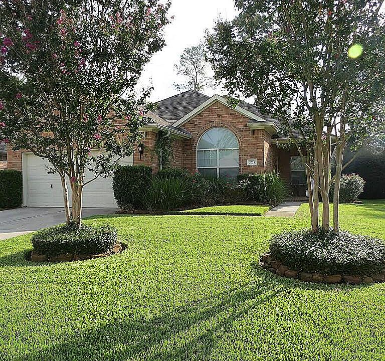 One story home ready for move in. Location is fantastic. Only 7 min from I-45. Large covered front patio with ceiling fan. Leaded glass front door welcomes you. Cozy dual fireplace in main living room and dining. Large kitchen with 42'' cabinets & lots of counter space. Breakfast bar opens to living area for easy living & entertaining. Master suite has his and hers closets, double sinks separate shower & garden tub. Covered Patio in back. Sprinkler system & professional landscaping w/lighting.