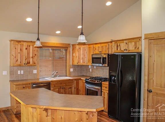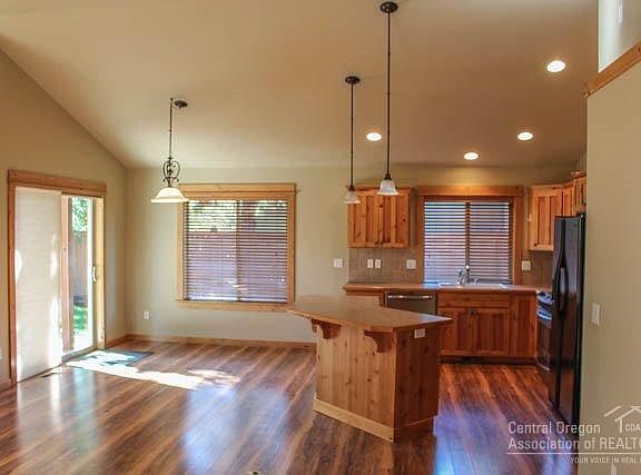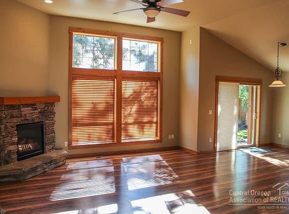 Quality Built Single Level Lodge Style Home in SE Bend! Charming 2004 built home features: custom lodge style front porch, slate entry, 3Bd/2Ba, knotty Alder cabs, doors & trim, vaulted great room w/stone gas FP, gas FA Heat + AC, extensive wood-lam flooring, master w/walk-in & bath w/skylight & dbl vanity, wood blinds throughout, fenced backyard w/big patio area & additional parking behind fence for boat, att finished/insulated garage, cement siding laundry/mud room w/wash basin, great SE location!