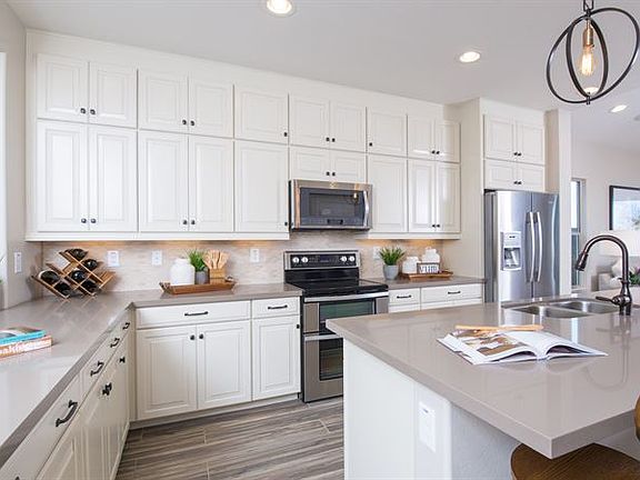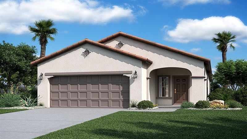 A covered front porch welcomes you into the new home. From the foyer you enter the dining room which connects to the center-island kitchen. The Great Room is spacious and opens to the rear covered patio allowing a flow from the indoor to the outdoor living space. The owner's suite is split from the secondary bedrooms and feature dual vanities and a large walk-in closet. Finishing touches include two-tone interior paint, upgraded cabinets with 42" uppers in the kitchen, a sink at the laundry room and front yard landscape. Complete backyard with turf and pavers. Solar panels installed.