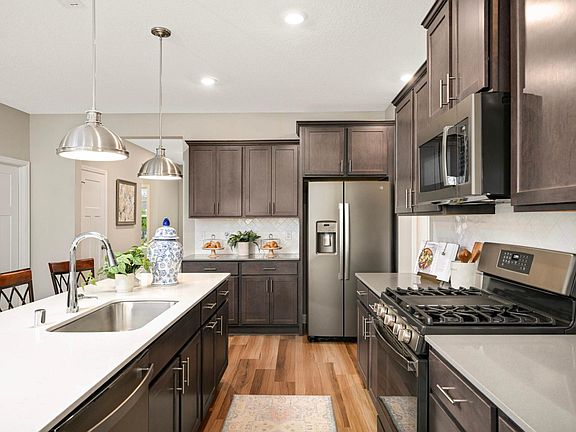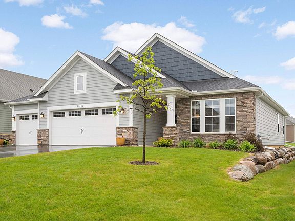 Gorgeous home bursting w/charm & character in the highly desirable Cedar Hills Neighborhood. Walk into (no interior or exterior steps) your beautiful two bedroom two bathroom three car garage home with amazing curb appeal! Home is open concept and a slab on grade with gorgeous LVP floors throughout main rooms. Kitchen boasts large center island, quartz countertops, full tile backsplash, brushed nickel hardware, staggered shaker cabinets, stainless steel appliances, walk-in-pantry and more! Great room is so inviting with windows galore and a gas, stone fireplace with mantel. Dining Room has room for a six person table with views to the gorgeous Sun Room with vaulted ceiling, ceiling fan, windows on every wall and slider out to the stamped concrete patio! Primary bedroom with an ensuite 3/4 bathroom with double sinks, quartz countertops, and large walk in closet. 2nd bedroom is gorgeous with floor to ceiling windows and also boasts a walk-in-closet! Full 2nd Bathroom with quartz countertops and deep bathtub, Laundry room is great with top loader washer and dryer, and utility room with all utilities easy to access. 3 car garage with tons of space for all those hobbies, asphalt driveway, irrigation system, association maintained lawn care and snow removal. Clubhouse is a street over with lots of amenities and pickle ball courts! Just a short commute to the cities with walking paths all around the community and ponds/lakes nearby. Downtown Lakeville is a short drive or walk to all the downtown restaurants and businesses. Farmington School District.