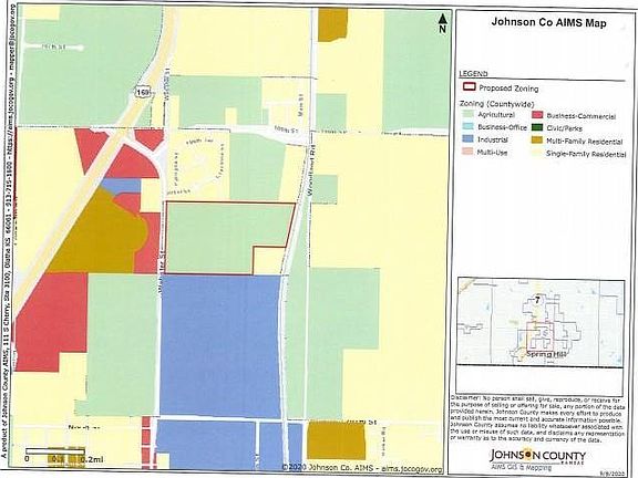 60.48 ACRES +/- that is surrounded by the City of Spring Hill, KS. No value is given to outbuildings or old farm house.The property is zoned RUR a Johnson County Zoning. The Master Plan by Sping Hill shows the vast majority of the parcel is Mixed Use Residential. (Implies 4 to 8 units per acre for density with some possible Commercial.) There is a small portion of the parcel that appears to have some Single Family on the Master Plan. Information is subject to verification.