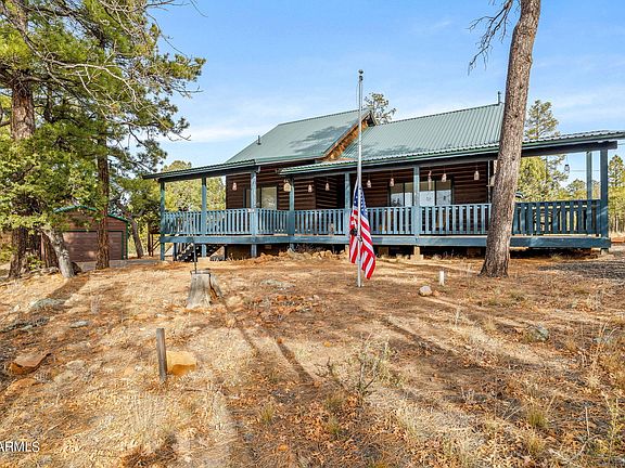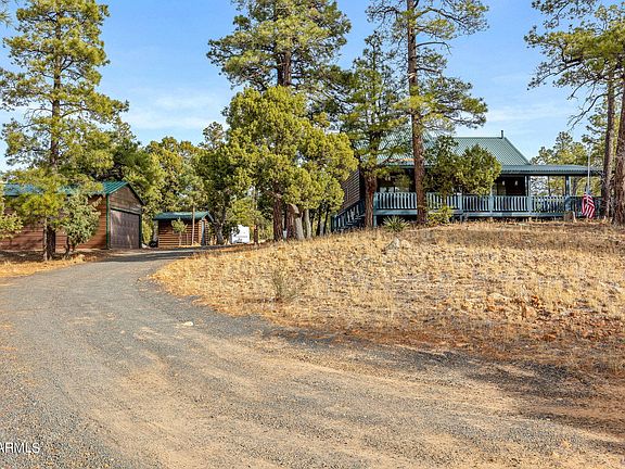 Welcome Home! This remote mountain getaway offers ample privacy with 2.49 acres of mixed trees nestled in the tall pines of Section 31. From the expansive front deck, enter this open floor plan home surrounded by picturesque windows, overflowing w/ natural light. The vaulted T&G ceilings, laminate wood flooring, gas fireplace and gas stove accent this two-bedroom two bath plus an add'l open loft/bedroom/den living space. The outside brings the natural woods feel w/ the log façade exterior, metal roof, two car detached garage, workshop, 1000 gallon underground water storage tank and a 1500 above ground water storage tank. No HOA. Bring the toys, friends and family to escape the heat and start living!